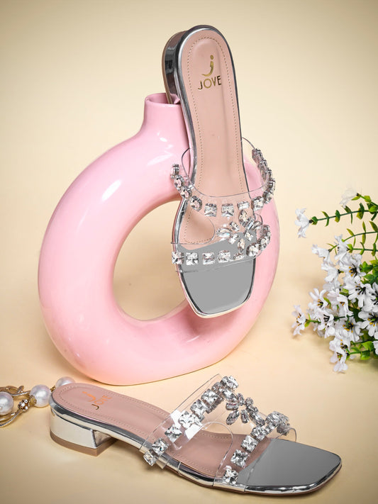 Women Silver Embellished Open Toe Flats