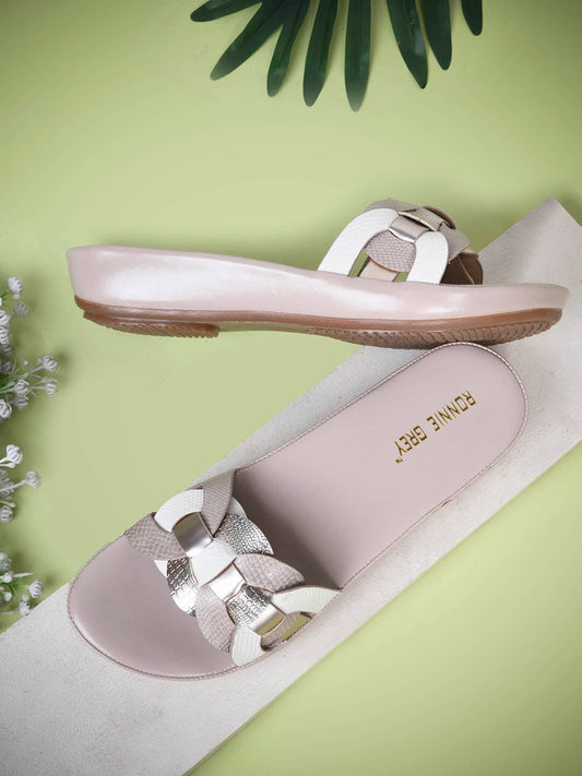 Women Champagne Embellished Open Toe Flats