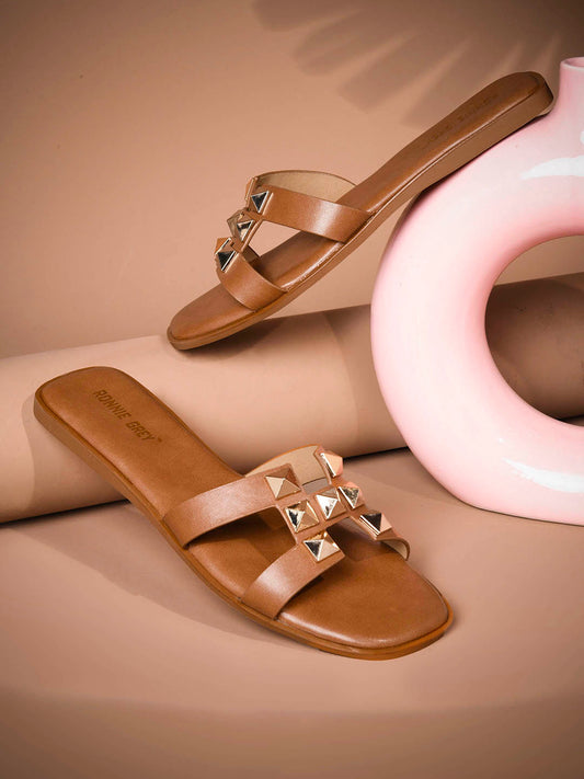 Women Tan Embellished Open Toe Flats