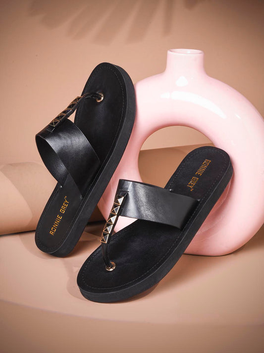 Women Black Textured T-Strap Flats